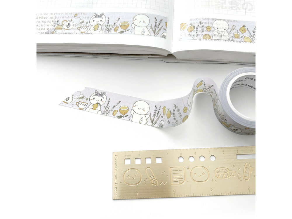 A sweet and sour washi?! This roll features emotis enjoying some whimsical lavender patches and journaling with a glass of lemonade! Illustrations originally painted for the April 2026 collection.